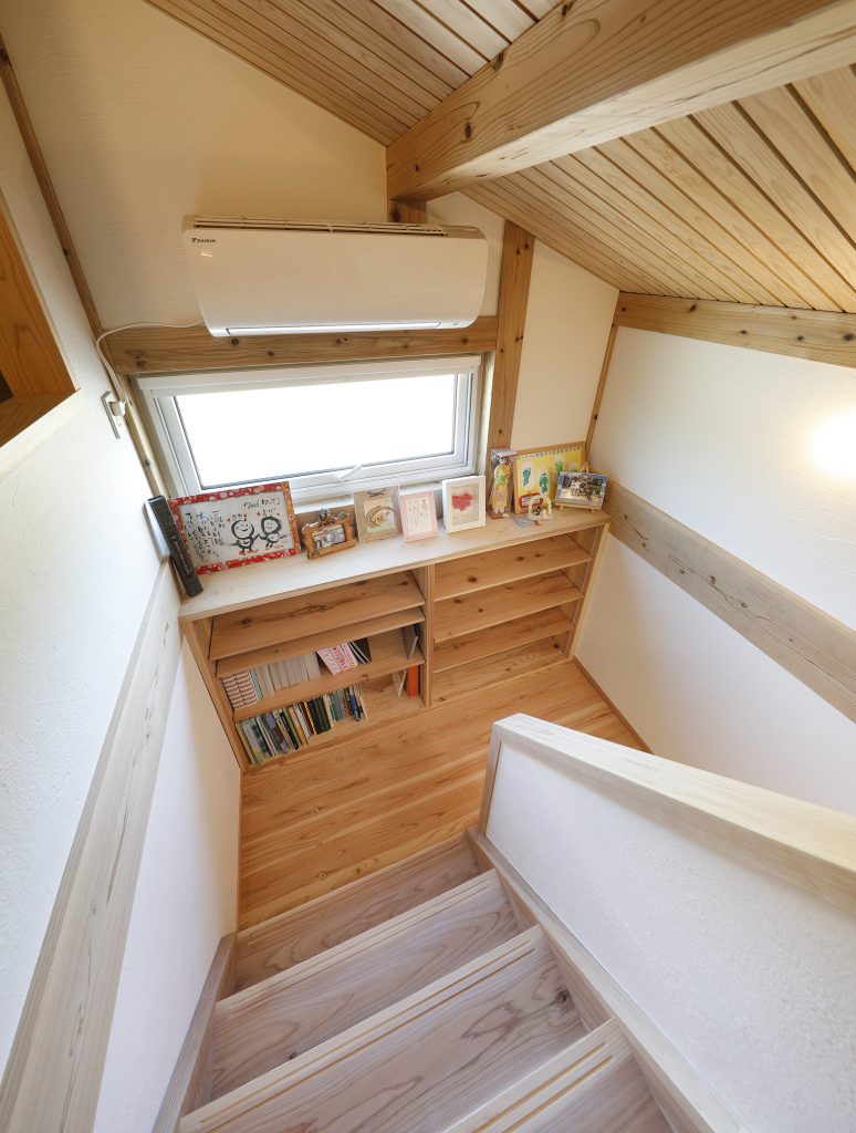 最小限の部屋数で、個室も決して広くはない。空間を十分に使えるよう、収納計画は綿密に立てた。そんな中でも、ロフトへの階段途中に読書スペースを設ける遊び心が同社らしい。踊り場に寝転がって本を読む。そんな微笑ましい風景がN邸の日常にはあるのだ。