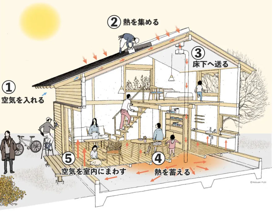 木楽な家では、太陽熱で新鮮空気を温めて床下に入れ込む「陽のまど」を採用しています。