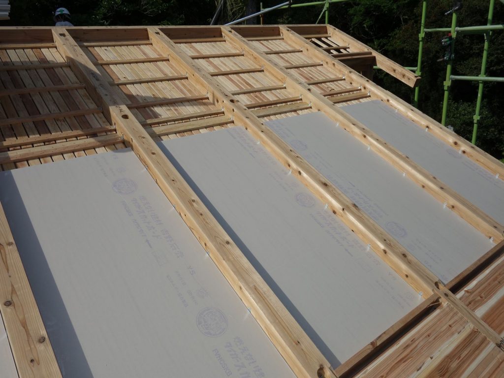 この上にネダノン28㎜を打ち、屋根強度を上げています。もちろん、全棟許容応力度計算をして、耐震等級3・耐風等級2を標準でクリアしています。