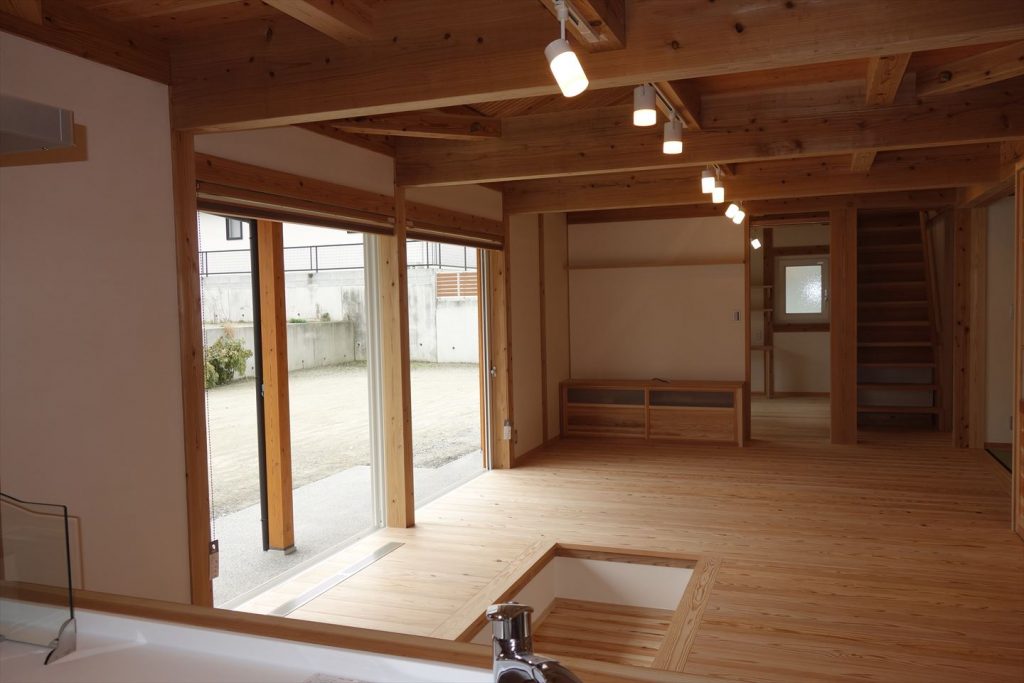 20帖のLDK。堀こたつ仕様です。ヒーターはなく、びおソーラーと床下エアコンの熱で温まる仕組みです。