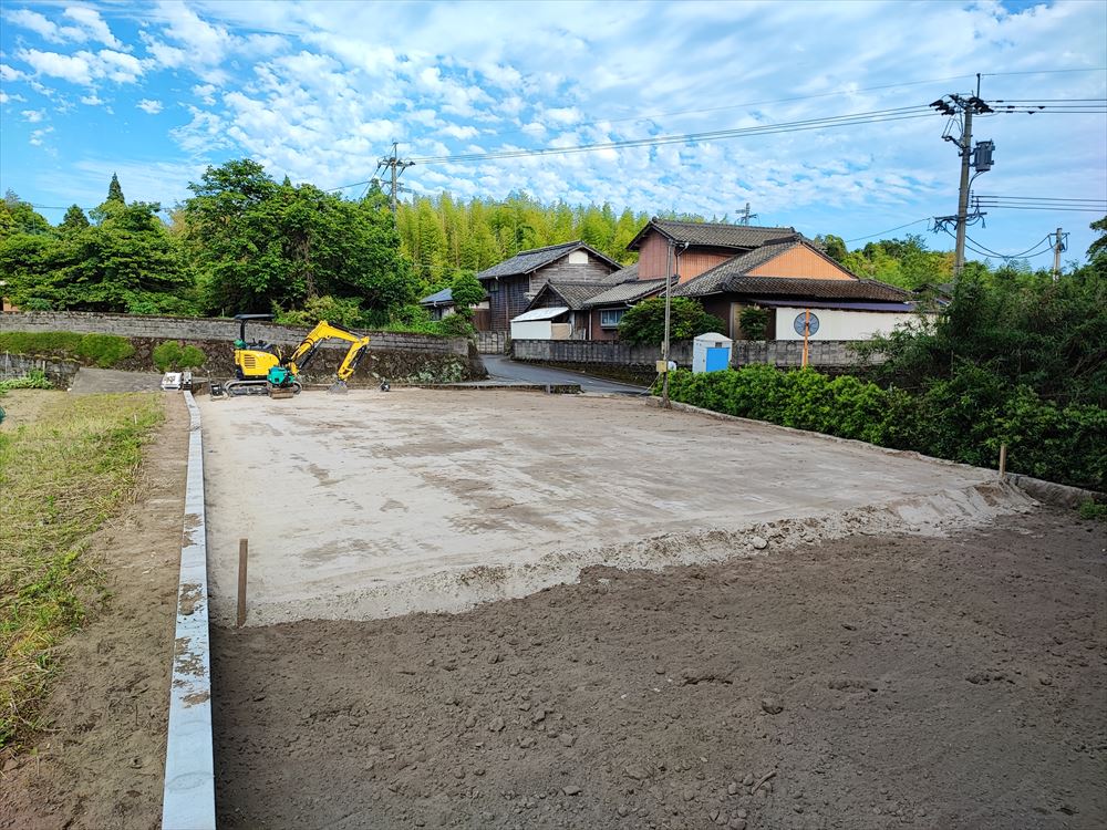 現況地盤が周囲の土地より低いので、30㎝程度シラス土を入れて嵩上げします。